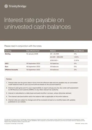 TrinityBridge is a trading name of TrinityBridge Limited (registered in England and Wales under company number 01644127) and TrinityBridge Fund Management Limited (registered in England and Wales under company number 02998803). Both companies are authorised and regulated by the Financial Conduct Authority. Registered office: Wigmore Yard, 42 Wigmore Street, London, W1U 2RY. Financial Education Services and Tax Services are not regulated by the Financial Conduct Authority. TrinityBridge (Guernsey) Limited is registered in the Bailiwick of Guernsey under company number: 68599 and is licensed by the Guernsey Financial Services Commission. Registered office: Suite 1, First Floor, Windsor House, St. Peter Port, Guernsey GY1 1WF. All rights reserved. © Copyright 2025 TrinityBridge